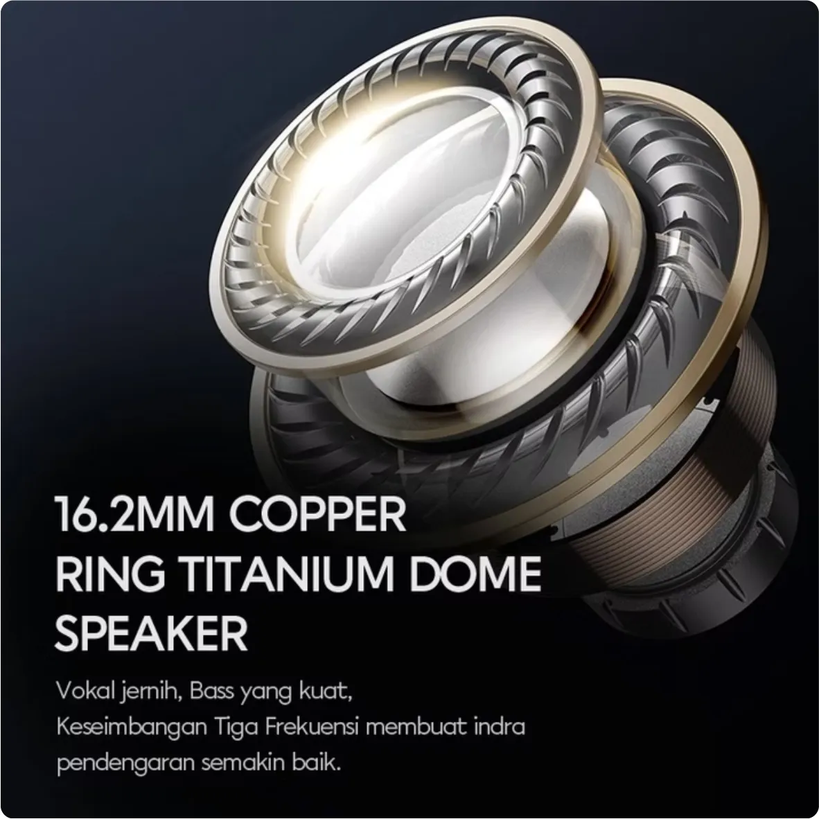 - Audio Extra Bass dengan driver ~16.2-16.3 mm + Copper Ring Titanium Dome — untuk bass lebih kuat & suara yang dinamis.